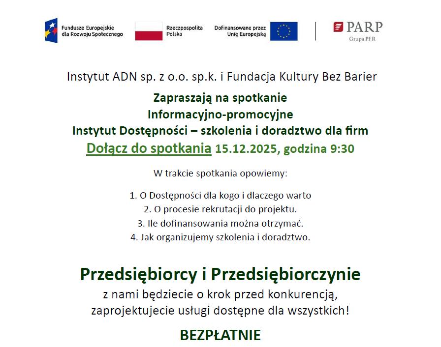 Zapraszamy przedsiębiorców z terenu całej Polski do udziału w nowym projekcie „Instytut Dostępności”, realizowanym przez Instytut ADN w partnerstwie z Fundacją Kultury bez Barier. To wyjątkowa okazja, aby bezpłatnie podnieść kompetencje swojej firmy w zakresie dostępności i uniwersalnego projektowania usług oraz produktów.